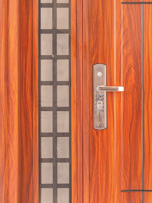 This Hawaii steel door in a mother and son style comes in a 1200 mm size with an integrated glass panel. Designed with a warm wood-grain finish, it combines durability with aesthetic appeal. The larger main door ensures smooth entry, while the smaller side panel with glass detail allows natural light to filter in, enhancing both visibility.This model is ideal as a main entrance door, balancing safety with multi locking system.