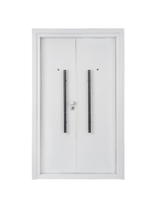 A spacious 1200 mm steel door with a middle open design and sleek bar handle. The matte white finish adds modern style, while its strong frame ensures durability, security, and elegance for main entrances.