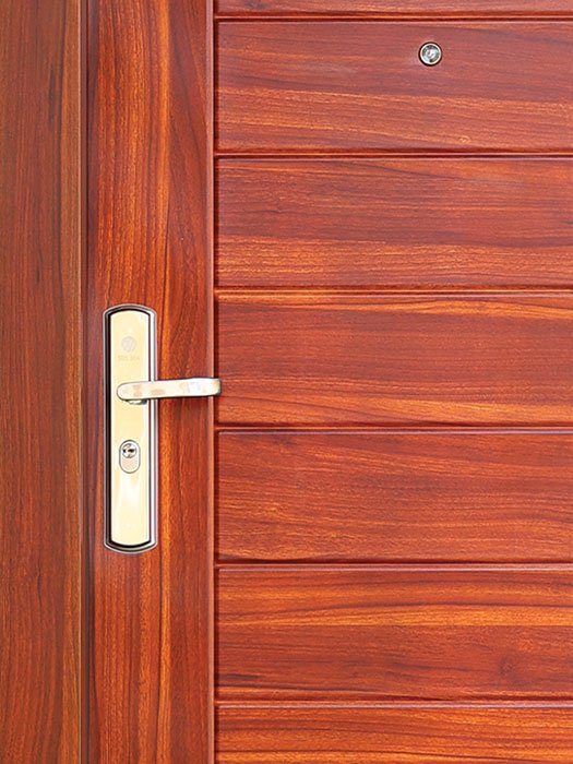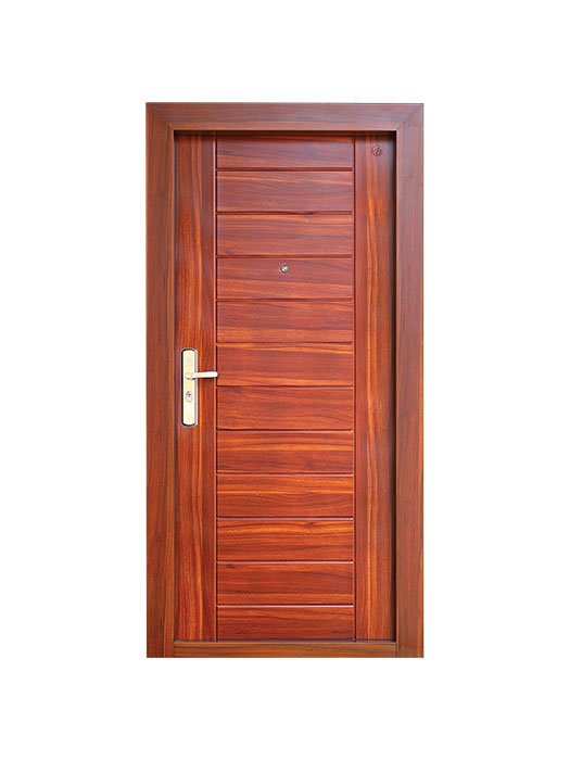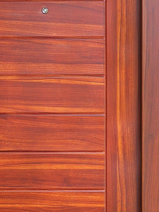 HD 40 Hawaii Steel Single Door A stylish teak-finish steel door with horizontal panel design, offering strength, durability, and secure locking for modern homes and offices.