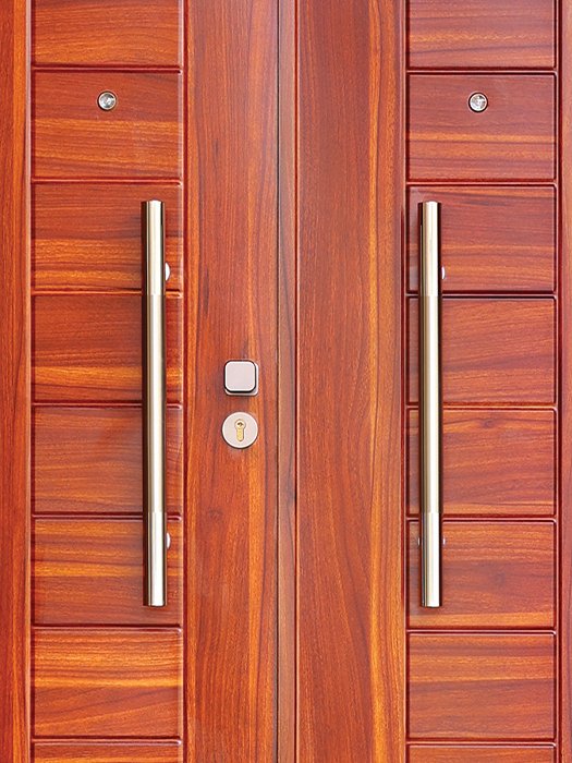 HD 40 1200 Hawaii Steel Door – Middle Open with Bar Handle A wide middle-open steel door in teak finish, featuring a sleek vertical bar handle for modern style, durability, and secure protection at main entrances.
