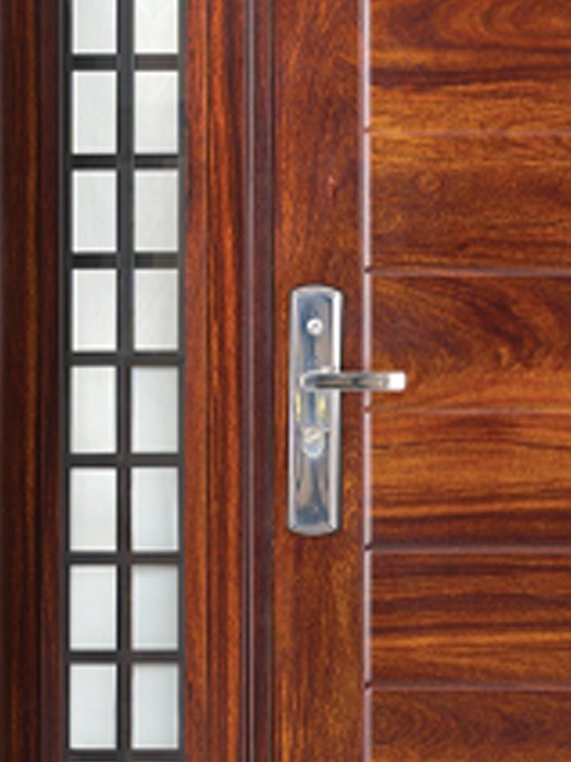 The HD 45 door cum window model 1200 size combines functionality with refined style. Finished in a rich wooden texture with horizontal panel design, it features an integrated window section fitted with toughened glass for light and visibility.