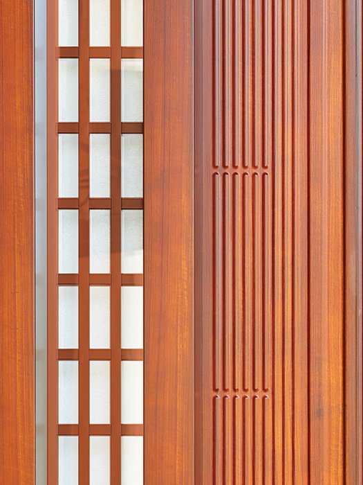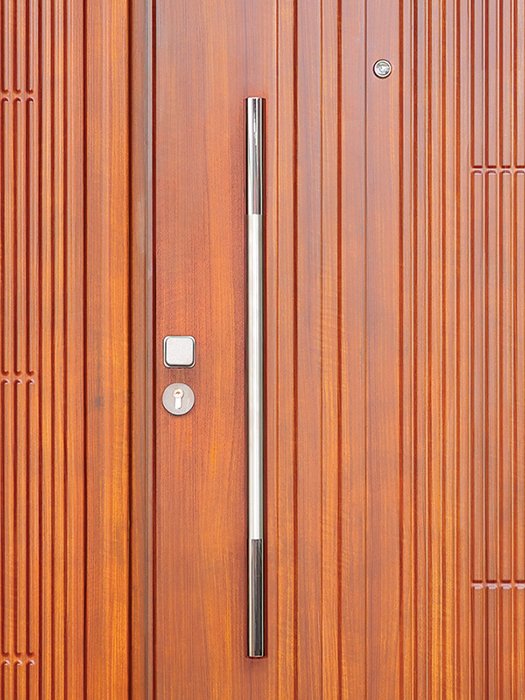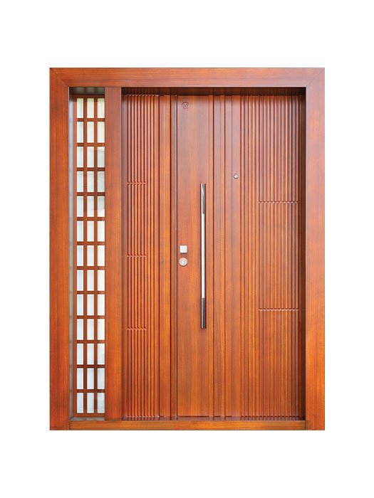 The HD 77 in a 1500 size offers an expanded view of elegance and security. Its dual-panel design ensures flexible access, while the grid-patterned glass enhances both the aesthetics and light flow. Built with high-quality steel and a wood-finish texture, it combines durability with modern charm for larger entrances along with multi locking system.