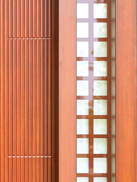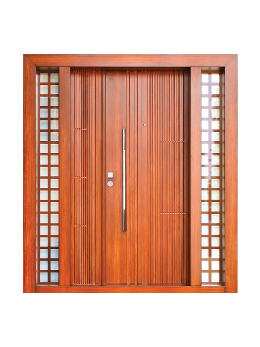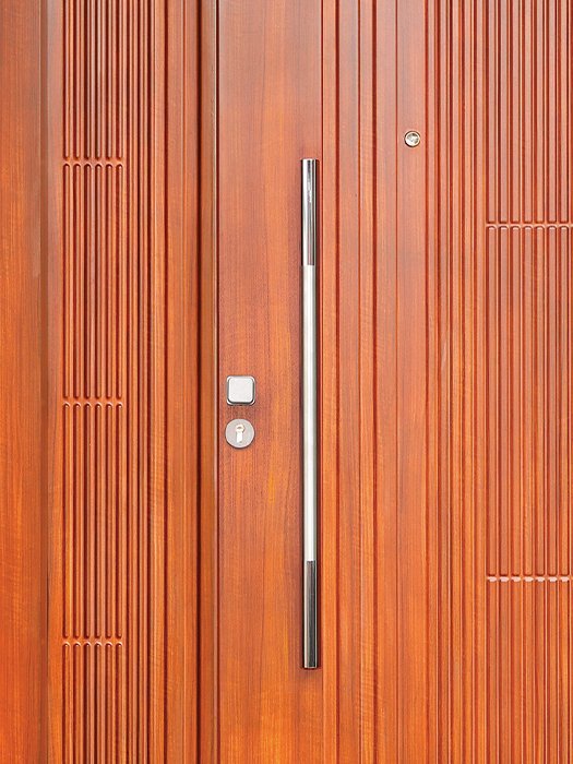 The HD 77 in 1800 size with a double glass window offers a sleek, modern design that maximizes natural light and visibility. With its full-length glass window panels on both sides, this door ensures an open, airy feel while providing enhanced security. The bar handle adds a contemporary touch to the door's strong, premium steel frame, with a wood-finish texture that complements any modern or traditional home.