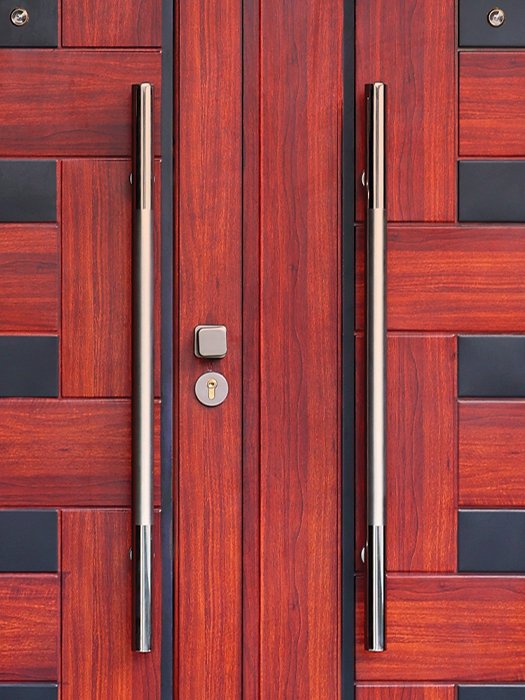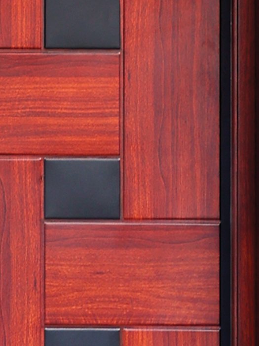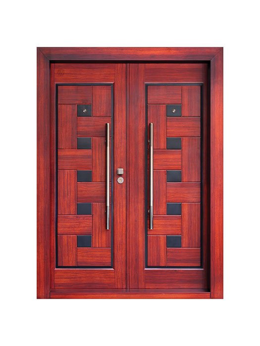 The HD 100 Double Door is a grand 1500 mm wide entrance solution, designed with a middle-open system for elegance and functionality. Both panels feature a bold geometric wood-grain design with deep reddish finish and contrasting black accents, creating a modern and sophisticated look.